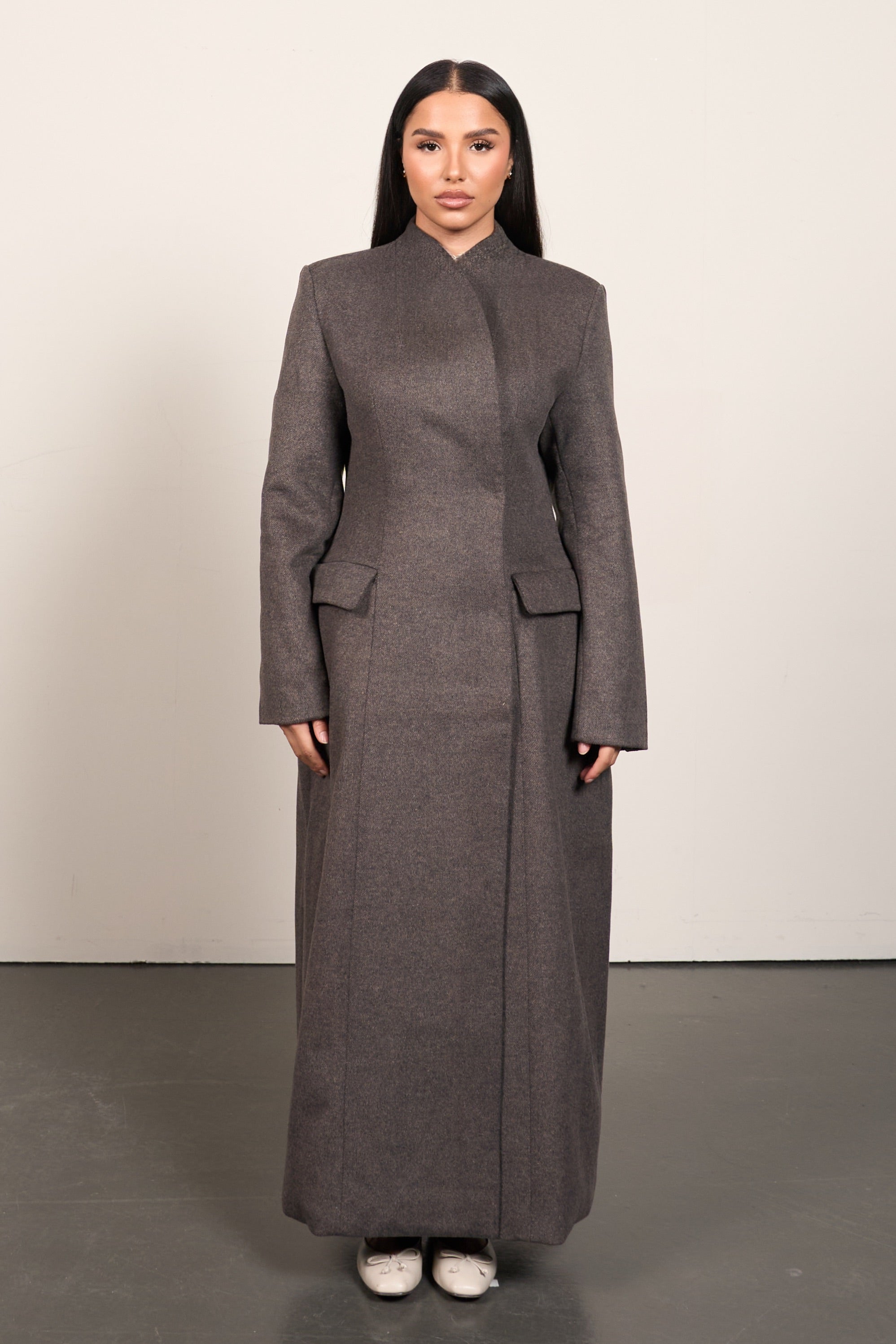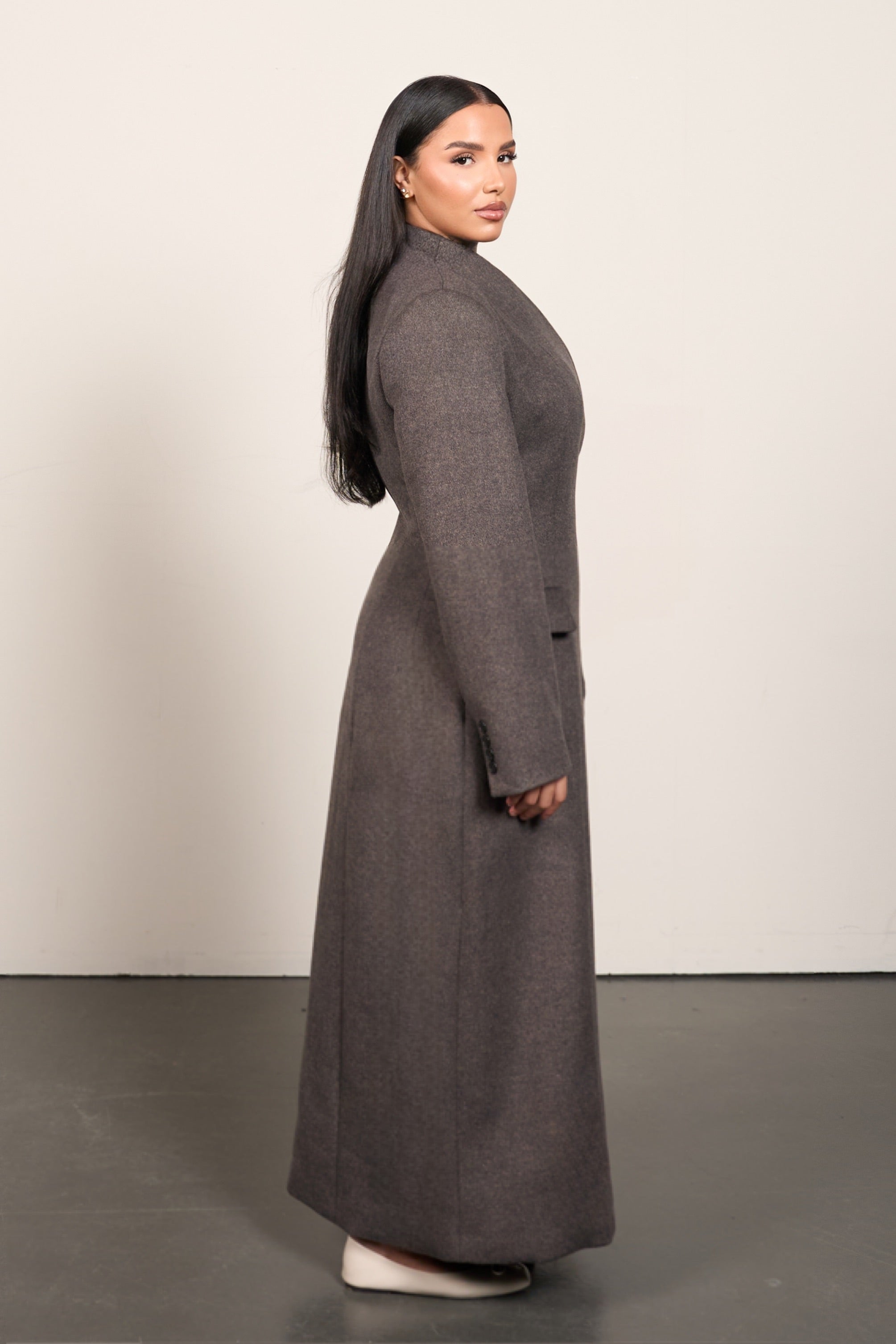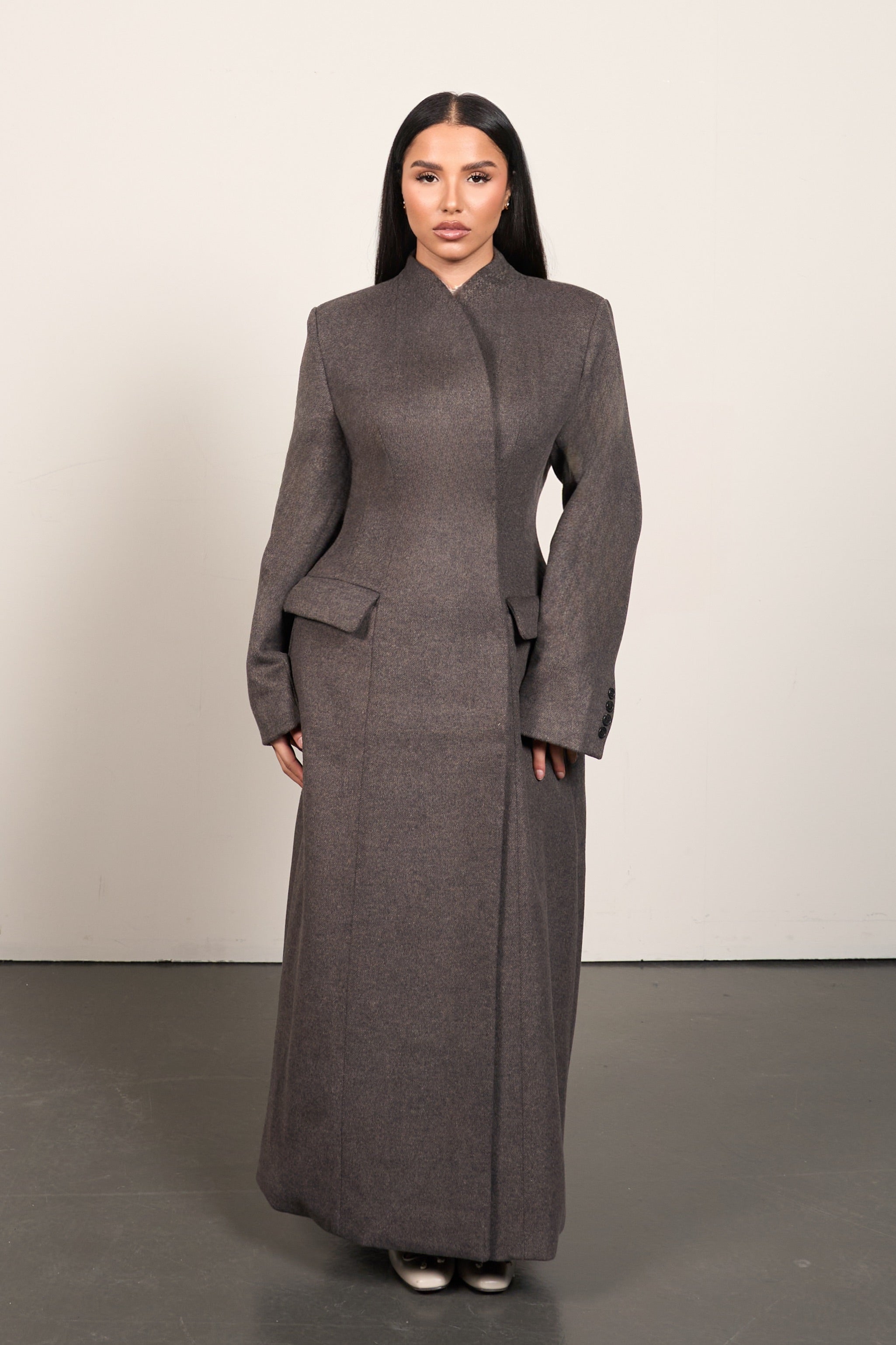 A long, structured wool-blend waist coat designed to create a clean, tailored silhouette. The fitted waist subtly shapes the body, while the full-length design adds elegance and height.