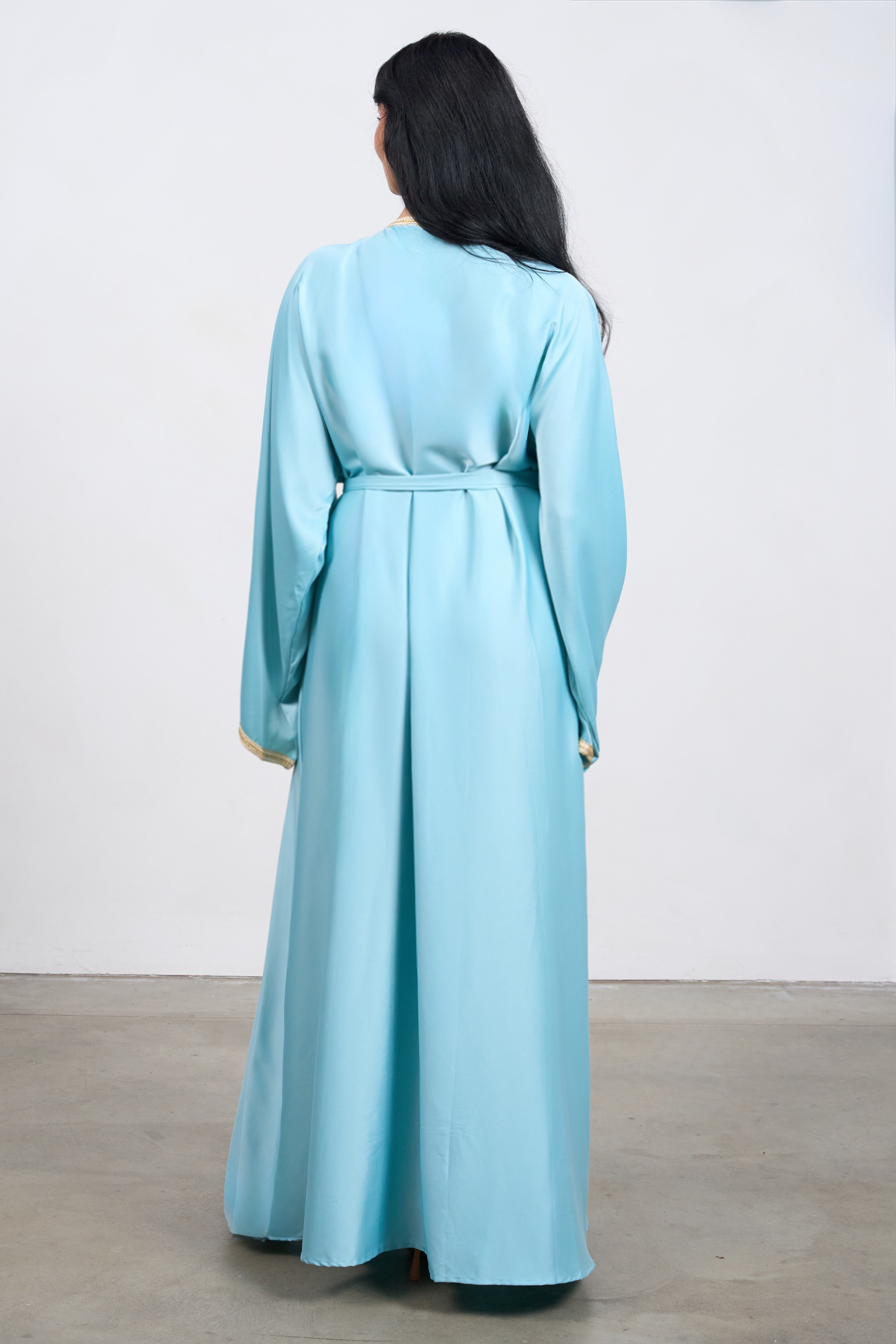 Made from a smooth, flowing fabric in a soft yellow hue, it drapes beautifully and offers all-day comfort. The matching belt allows you to tailor the fit to your style — perfect for weddings, Eid celebrations, or formal evening events.