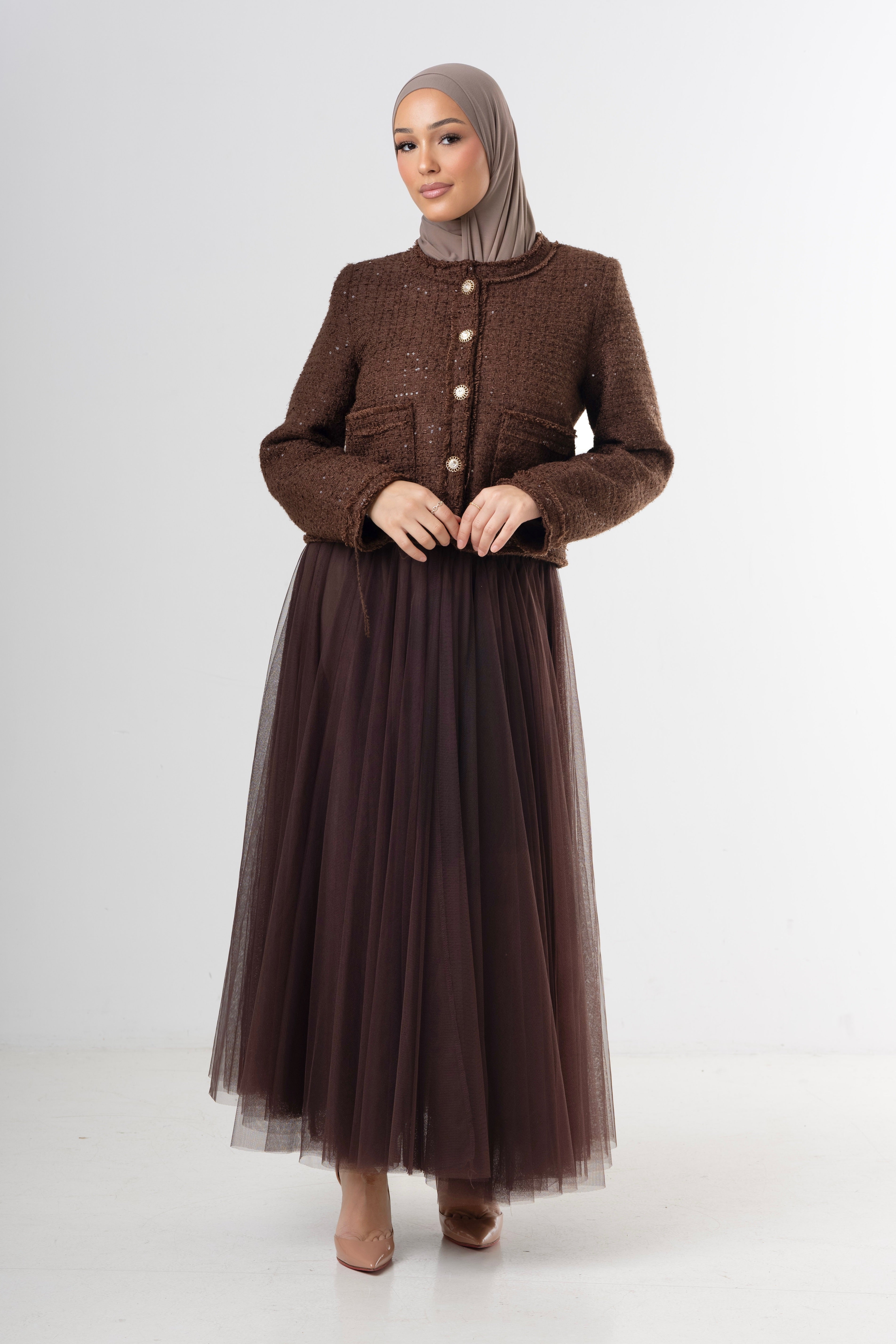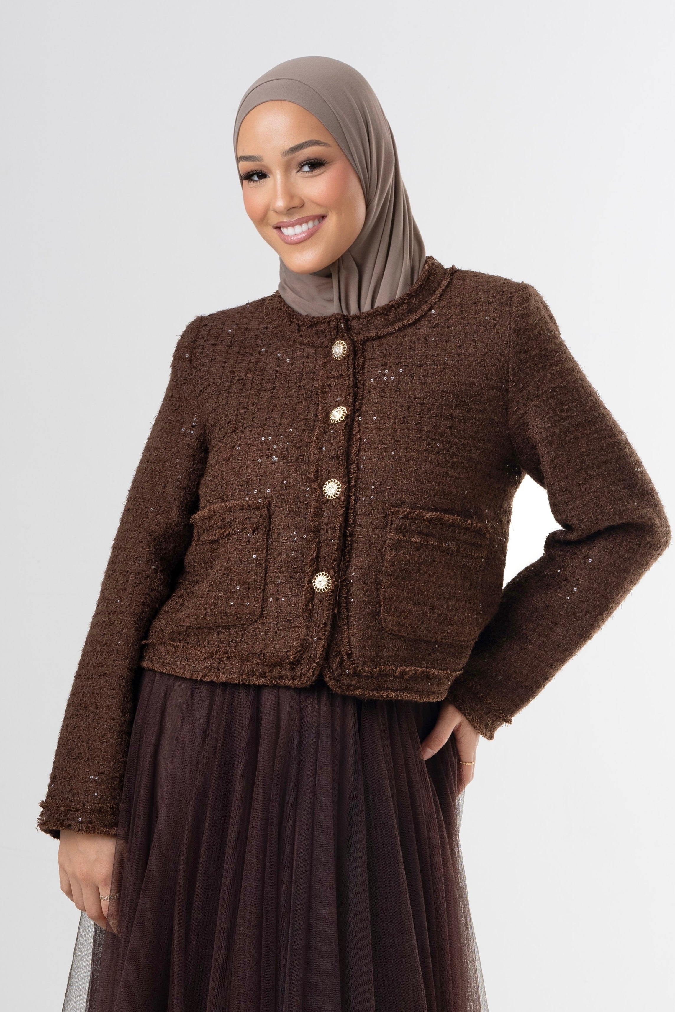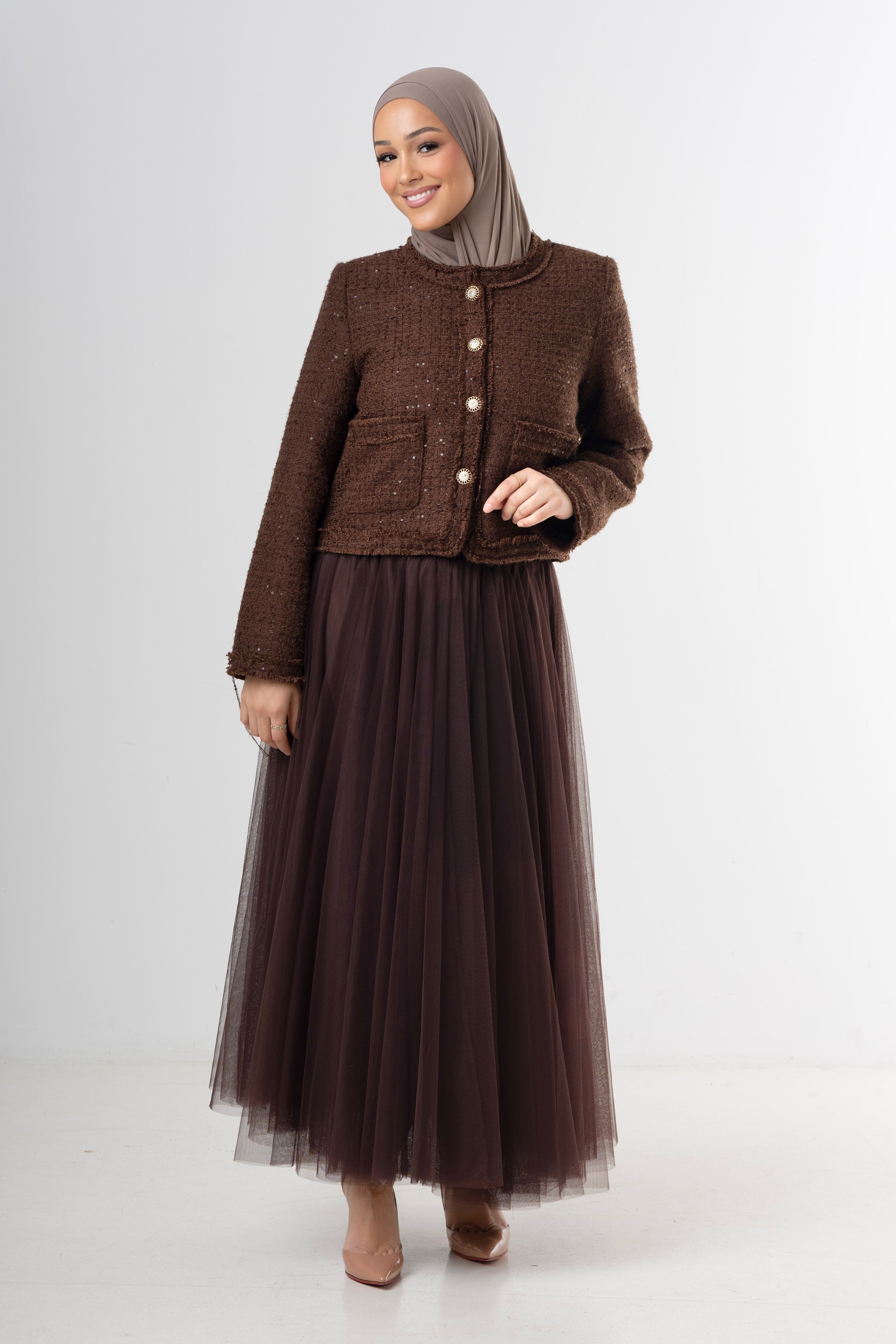 The Classic Brown Tweed Jacket is a timeless wardrobe piece with a refined, structured silhouette. Crafted from a textured tweed fabric in a rich brown tone, this jacket features elegant gold-tone buttons and subtle shimmer details woven into the fabric.