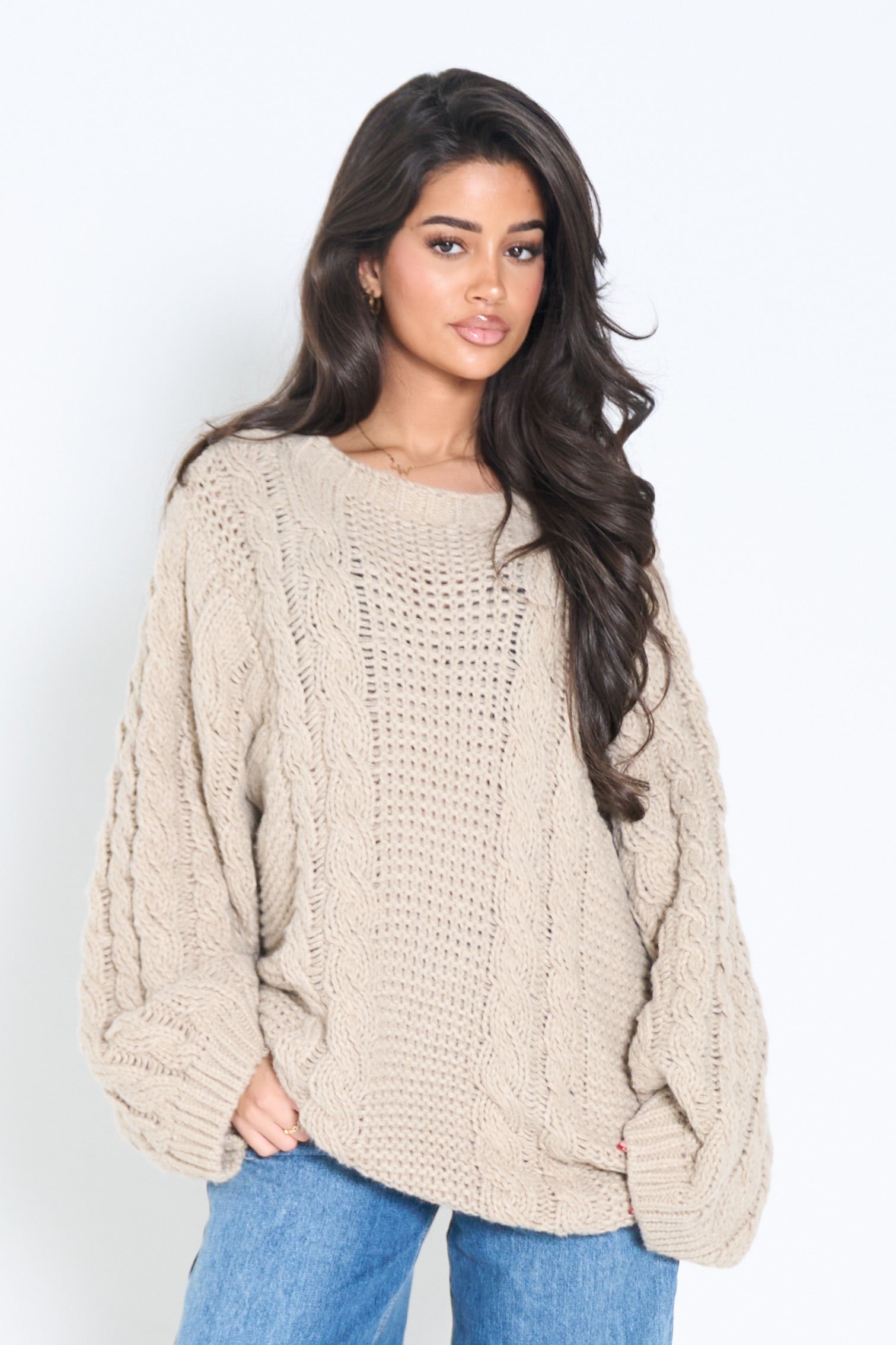 Wrap yourself in comfort and effortless style with the Cozy Cable Knit Sweater. This oversized knitted sweater features a classic cable pattern with an airy center weave, giving it a relaxed yet chic look. The soft beige tone makes it easy to pair with your favorite jeans, trousers, or skirts. Perfect for chilly days, cozy evenings, or a laid-back street style outfit.