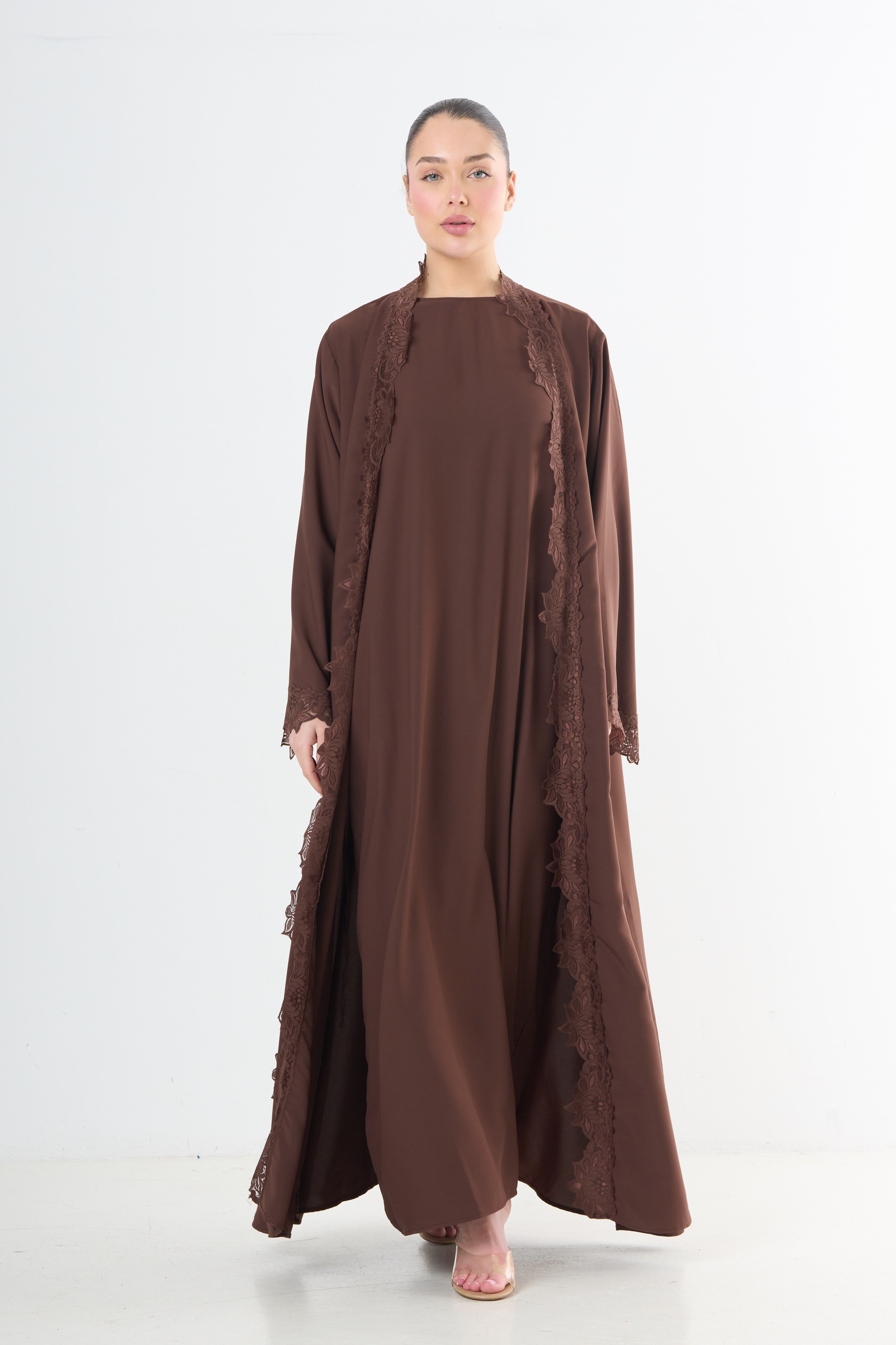 Sophisticated abaya ensemble showcasing delicate lace ornamentation throughout. The one-size silhouette offers a flowing, spacious fit that complements various body proportions with understated refinement. Designed for those seeking a versatile piece that balances aesthetic sophistication with practical comfort. Styled on a 1.70m frame for fit guidance.