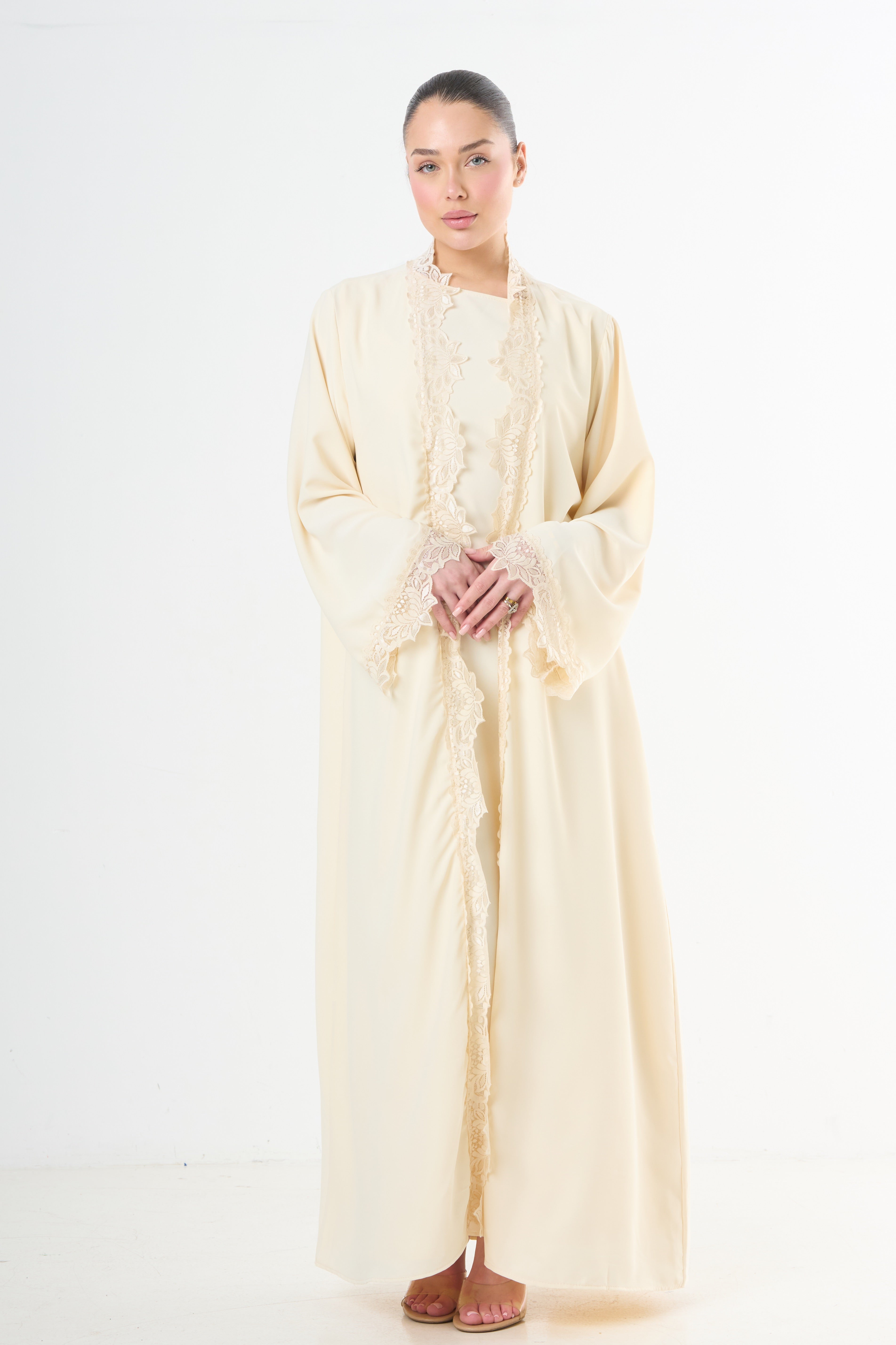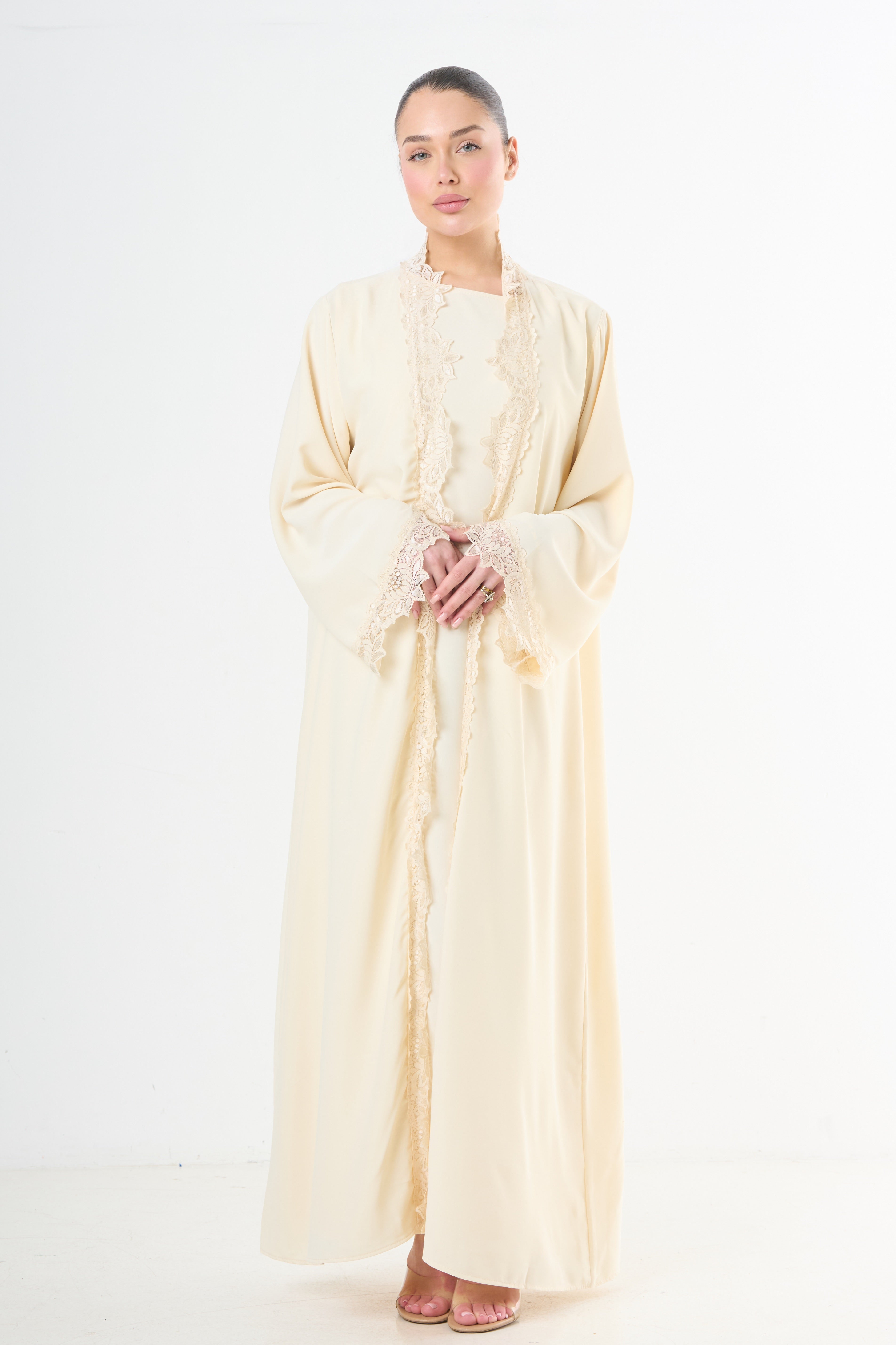 Sophisticated abaya ensemble showcasing delicate lace ornamentation throughout. The one-size silhouette offers a flowing, spacious fit that complements various body proportions with understated refinement. Designed for those seeking a versatile piece that balances aesthetic sophistication with practical comfort. Styled on a 1.70m frame for fit guidance.