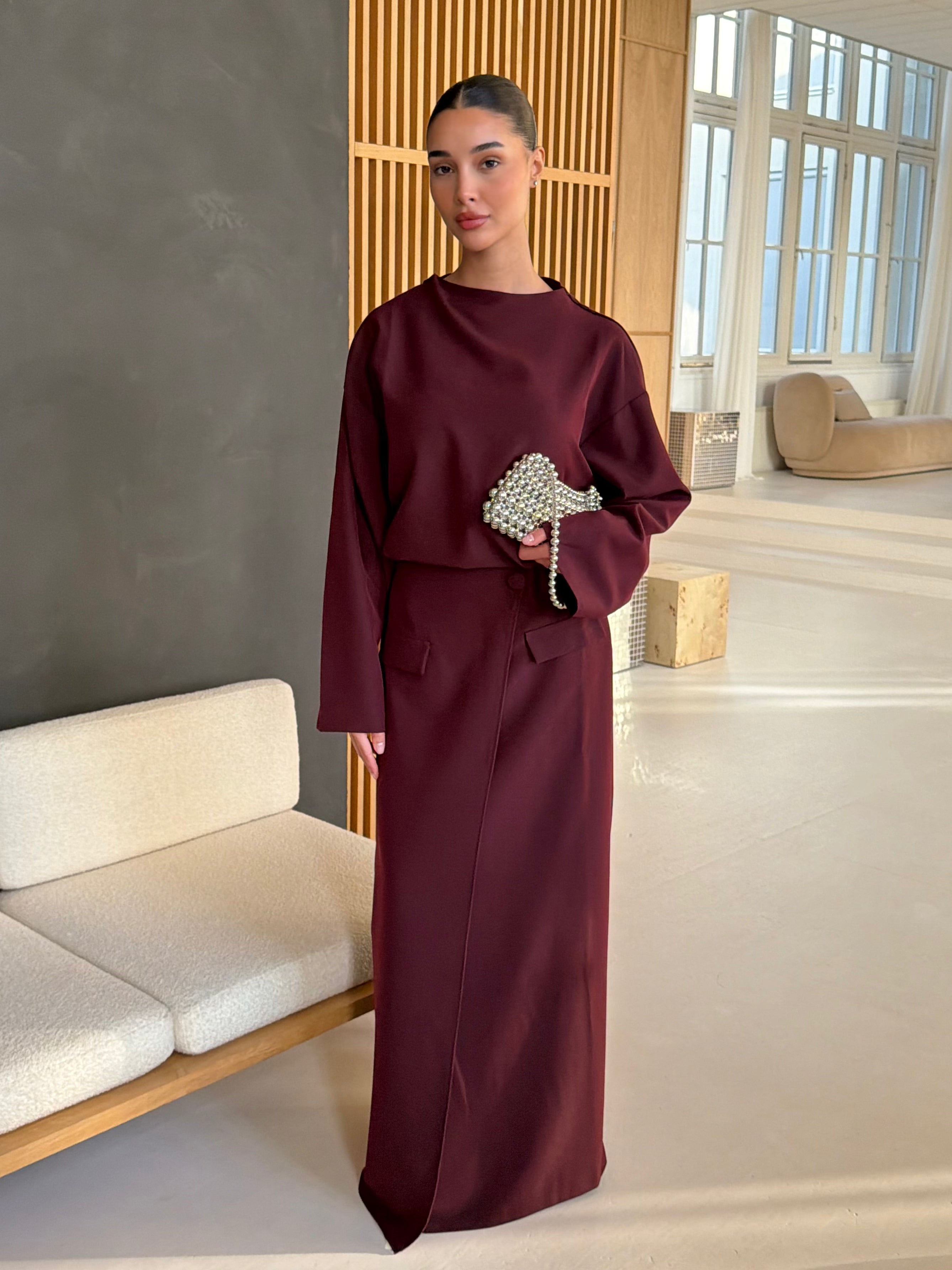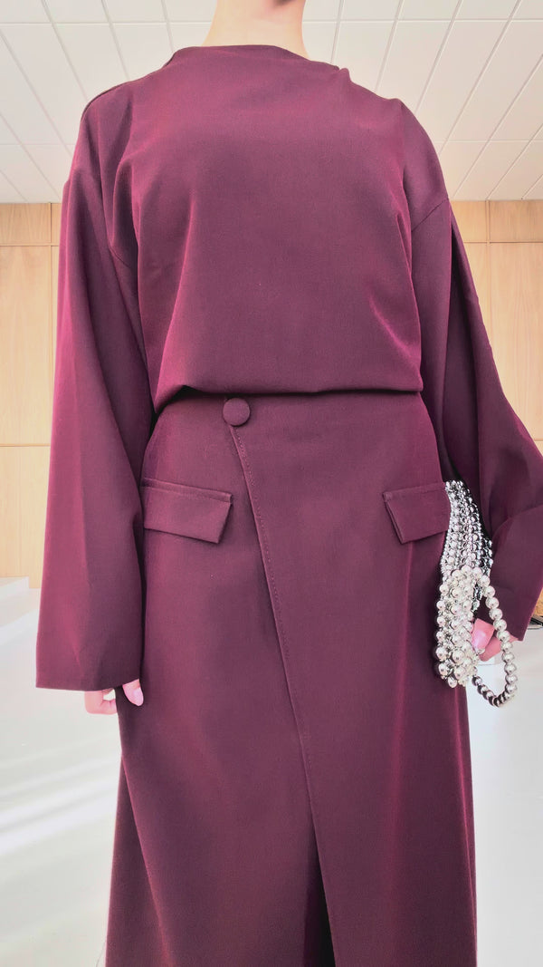 This Wine two-piece wrap skirt set features a minimalist top with wide sleeves and a flowing maxi wrap skirt. Designed for an elegant and modern silhouette, this co-ord set is suitable for formal occasions, workwear and modest fashion styling.